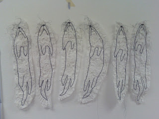 I am trying to interpret taxidermy through the fiber arts, since working with actually taxidermy materials would take a lot of time and knowledge that I don't have. I painted the antelope form red and I'm going to be putting pins in it to represent where the shops are. The weasels are made of a lace shower curtain and a whole bunch of zigzag stitch. I also stretched a deer hide over an embroidery hoop. I'll post it once it's dry.
